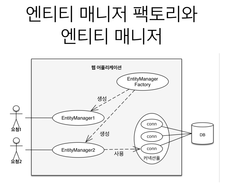 jpa는 웹 어플리케이션에 요청이 오면 EntityManagerFactory에서 EntityManager를 생성을 한 후 커넥션풀을 활용해 db에 접근하여 데이터를 저장하게 되는 과정이 일어난다.