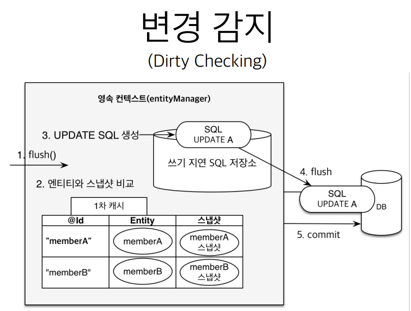변경 감지는 기존에 저장 되어 있던 스냅샷과 entity에 저장되어 있는 객체를 비교하는 방식으로 진행된다. 비교해서 다른 경우에는 자바의 컬렉션처럼 값을 변경만 해주면 update 쿼리가 실행되게 된다.