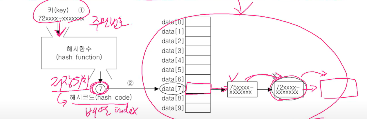 2. 해시코드(해시함수의 반환값)에 대응하는 링크드리스트를 배열에서 찾는다.