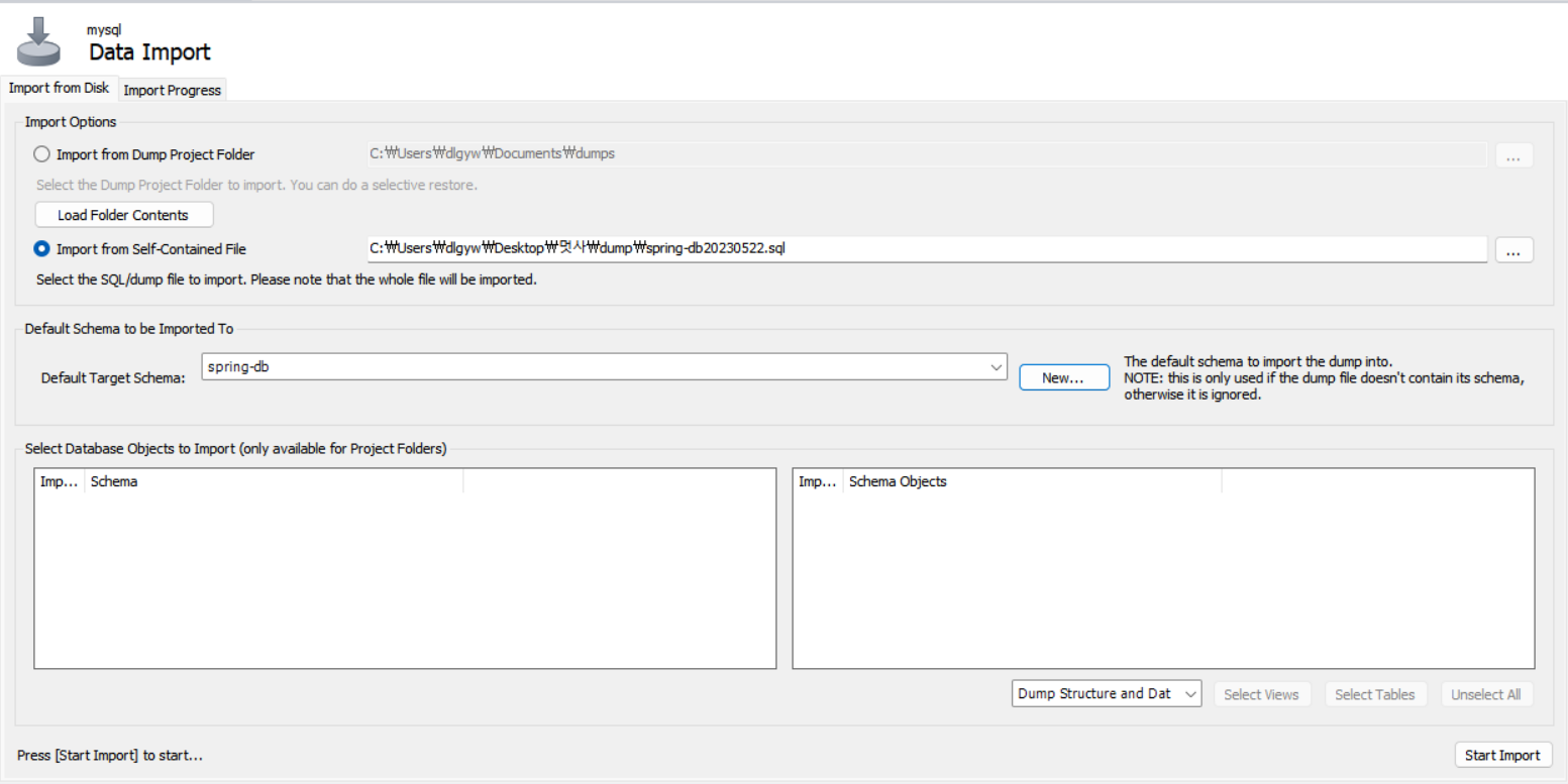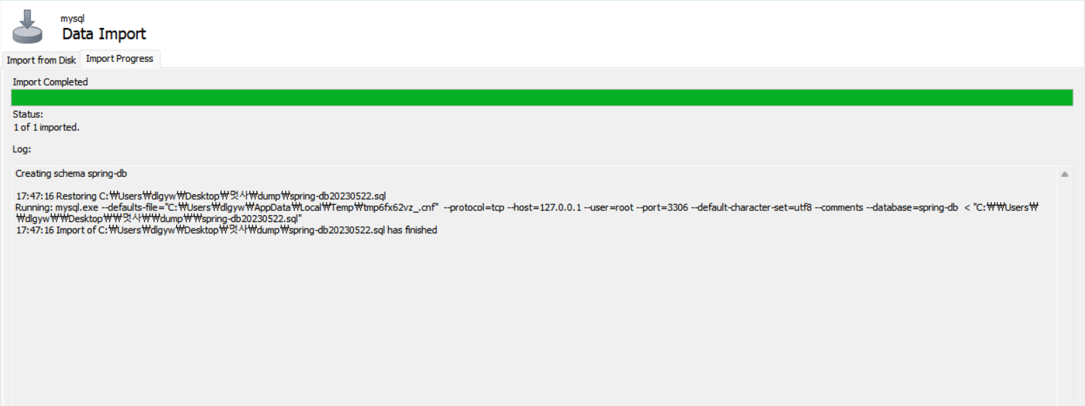 export와 비슷하게 server에서 import를 누르면 다음과 같은 화면이 나온다.