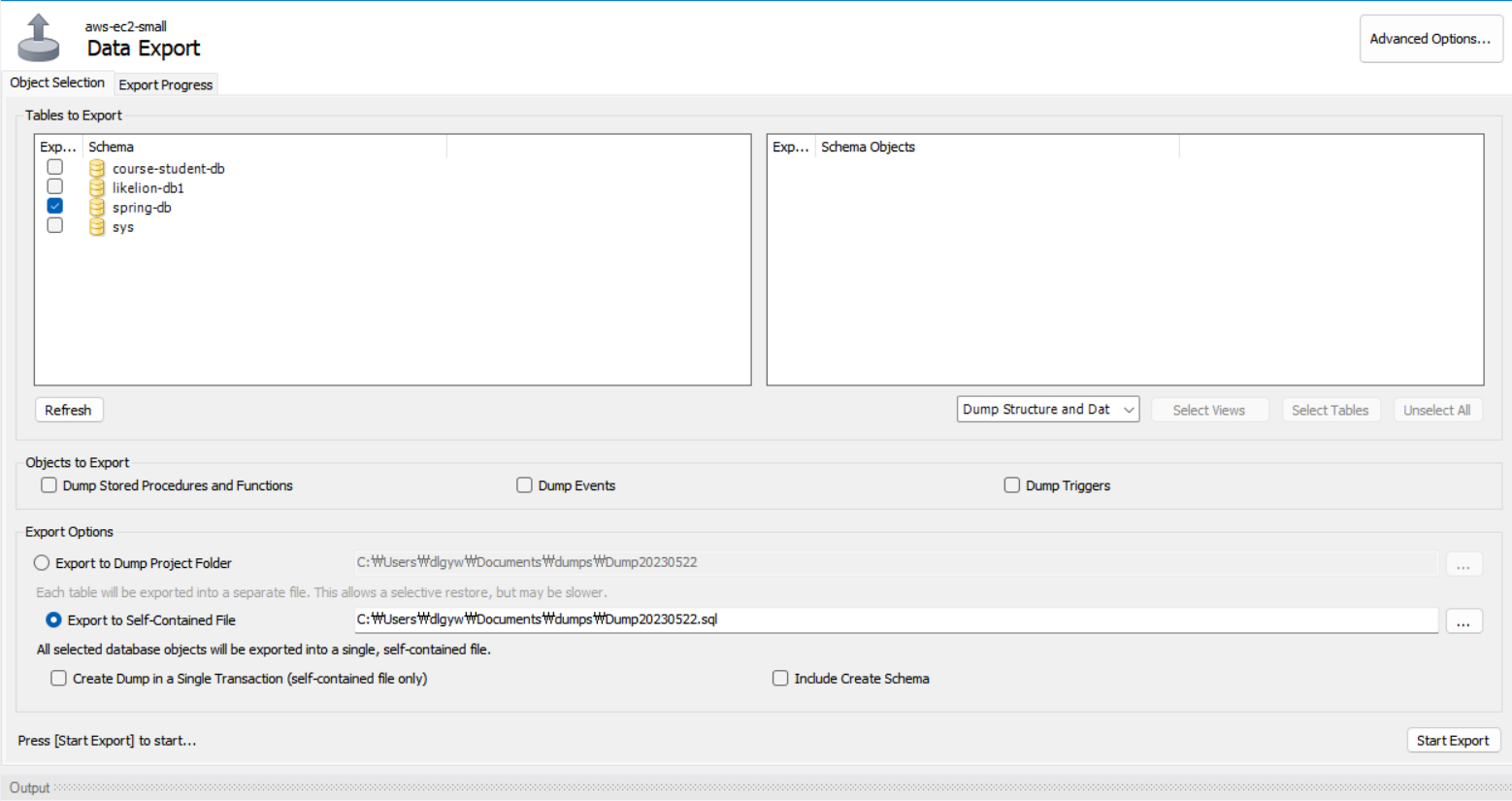 workbench에서 상단에 server에서 export를 누르면 다음과 같은 화면이 나온다. dump를 하고 싶은 스키마를 선택하도록 한다.