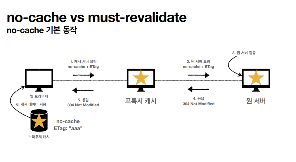 - no-cache : 데이터는 캐시해도 되지만, origin서버에 검증하고 사용해야 됨