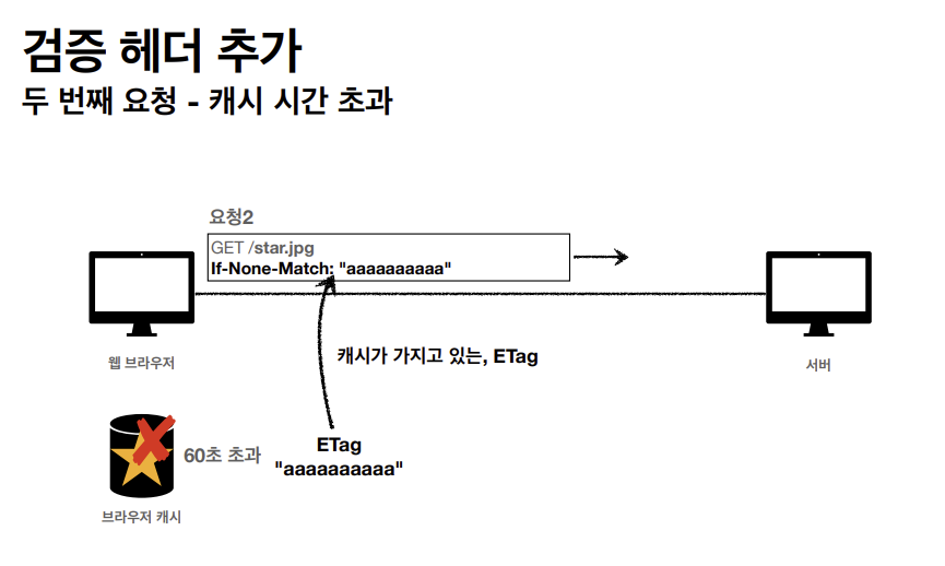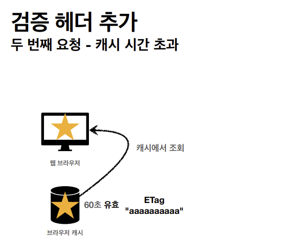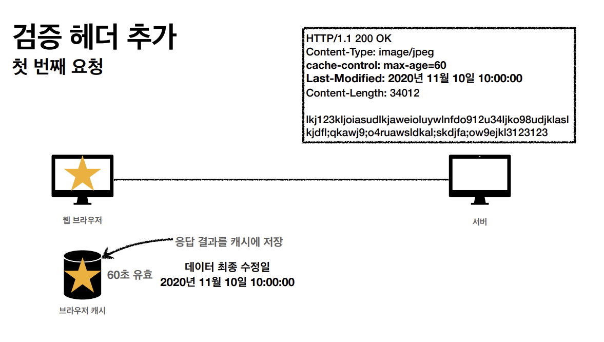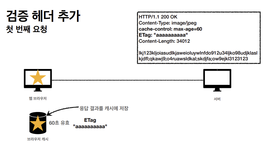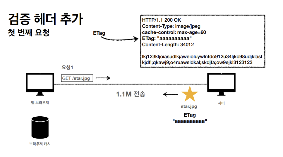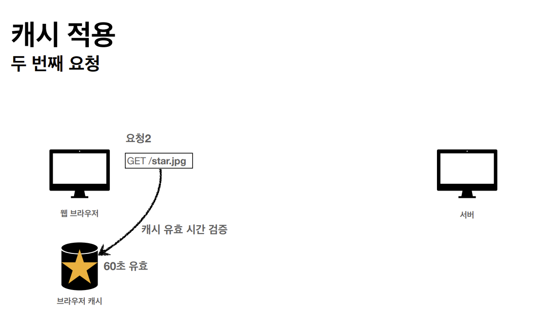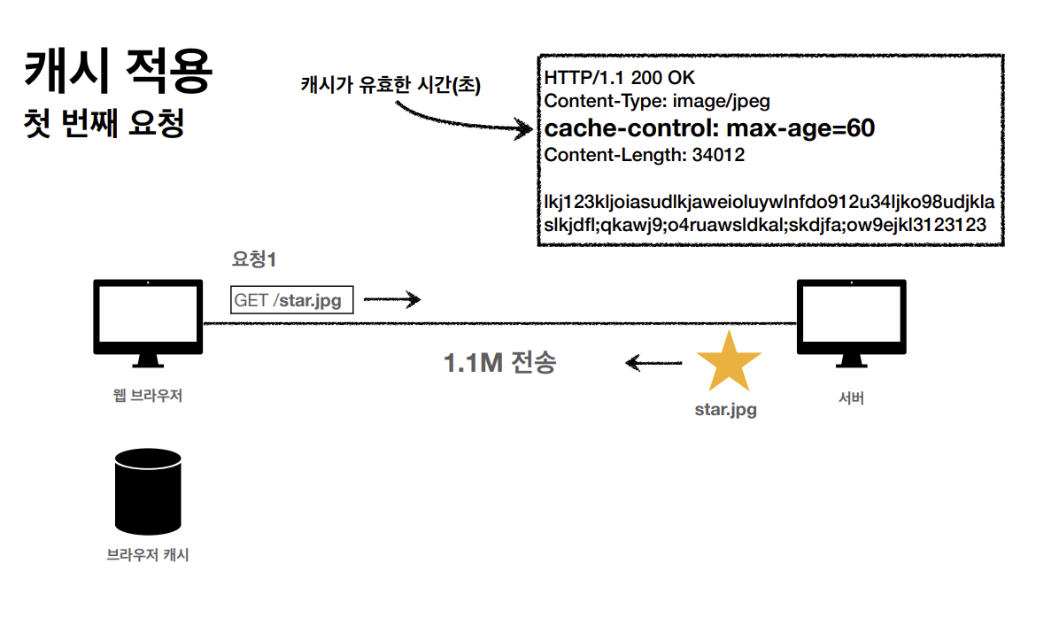클라이언트가 get메소드 방식으로 star.jpg를 요청한다. 서버가 클라이언트에게 응답을 할 때 아까와는 다르게 캐시 유효 시간을 http 헤더에 추가한다.