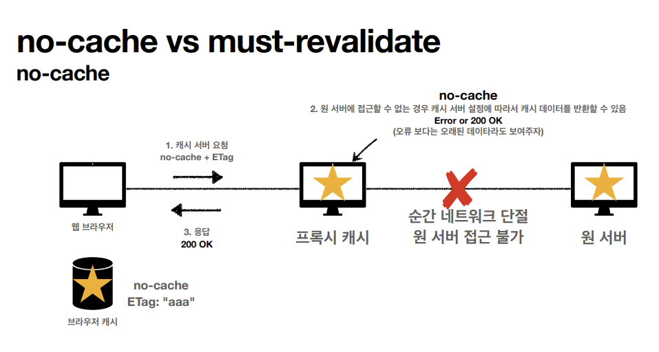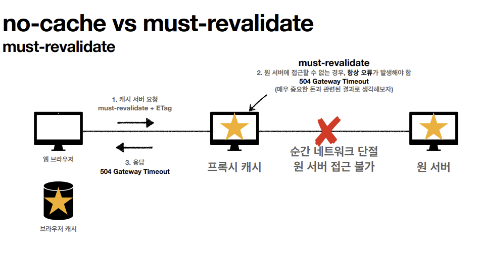 must-revalidate인 경우에는 원 서버와 접근이 불가하면 오류가 발생한다.
