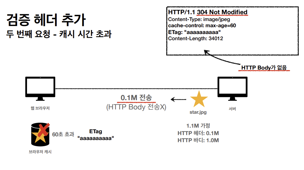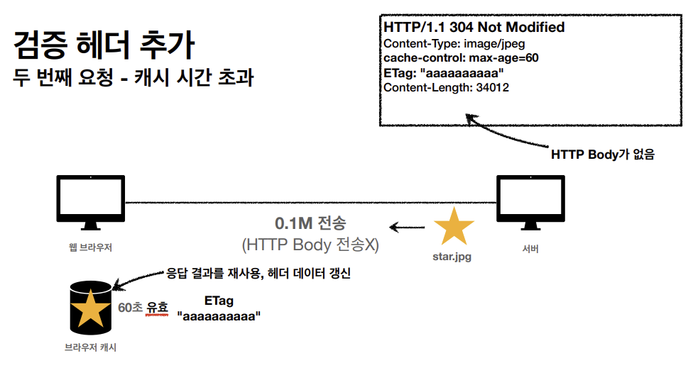 캐시 유효시간이 초과해도 서버의 데이터가 갱신되지 않는 경우에 304 + 헤더 메타 정보만 응답을 한다.