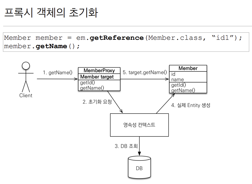 프록시 객체를 초기화할 때, 프록시 객체가 실제 엔티티로 바뀌는 것은 아니다. 초기화되면 프록시 객체를 통해서 실제 엔티티에 접근이 가능한 것이다.